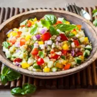 Masak quinoa hingga matang dan dinginkan. Potong tomat, mentimun, dan paprika menjadi potongan kecil. Campur semua bahan dengan minyak zaitun, perasan jeruk nipis, garam, dan merica. Aduk rata dan sajikan.